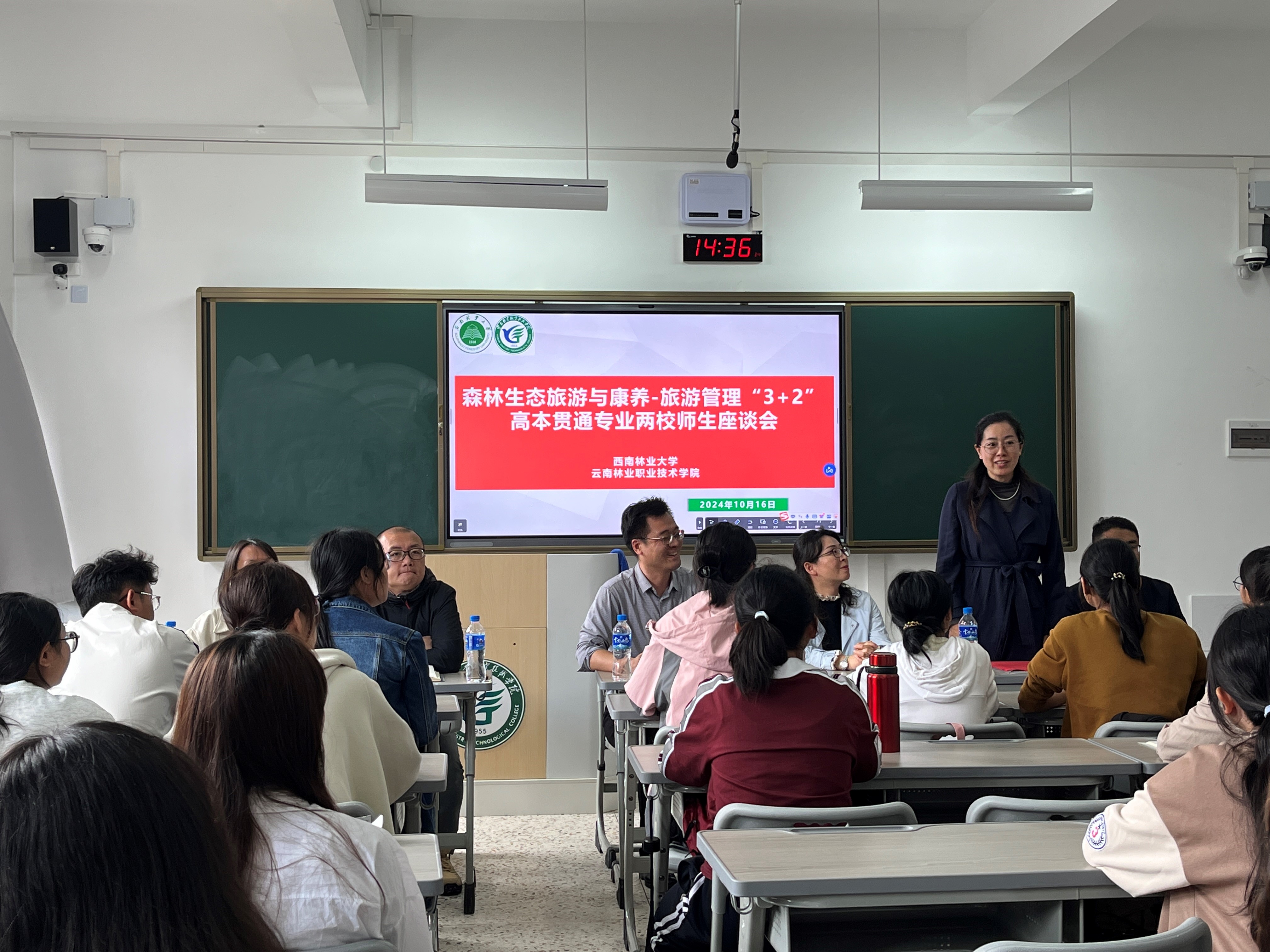 为响应国家及云南省关于职业教育与本科教育贯通培养的政策精神,10月16日williamhill英国威廉希尔与云南林业职业技术公司文化旅游公司在云南林业职业技术公司石林校区联合举办了森林生态旅游与康养-旅游管理“3+2”高本贯通专业师生座谈会。此次座谈会由云南林职院文化旅游公司副经理王丽娟主持,williamhill英国威廉希尔院领导、旅游管理系主任和云南林职院文化旅游公司院领导、森林生态旅游与康养(高本贯通)班辅导员和全体同学出席了此次会议。