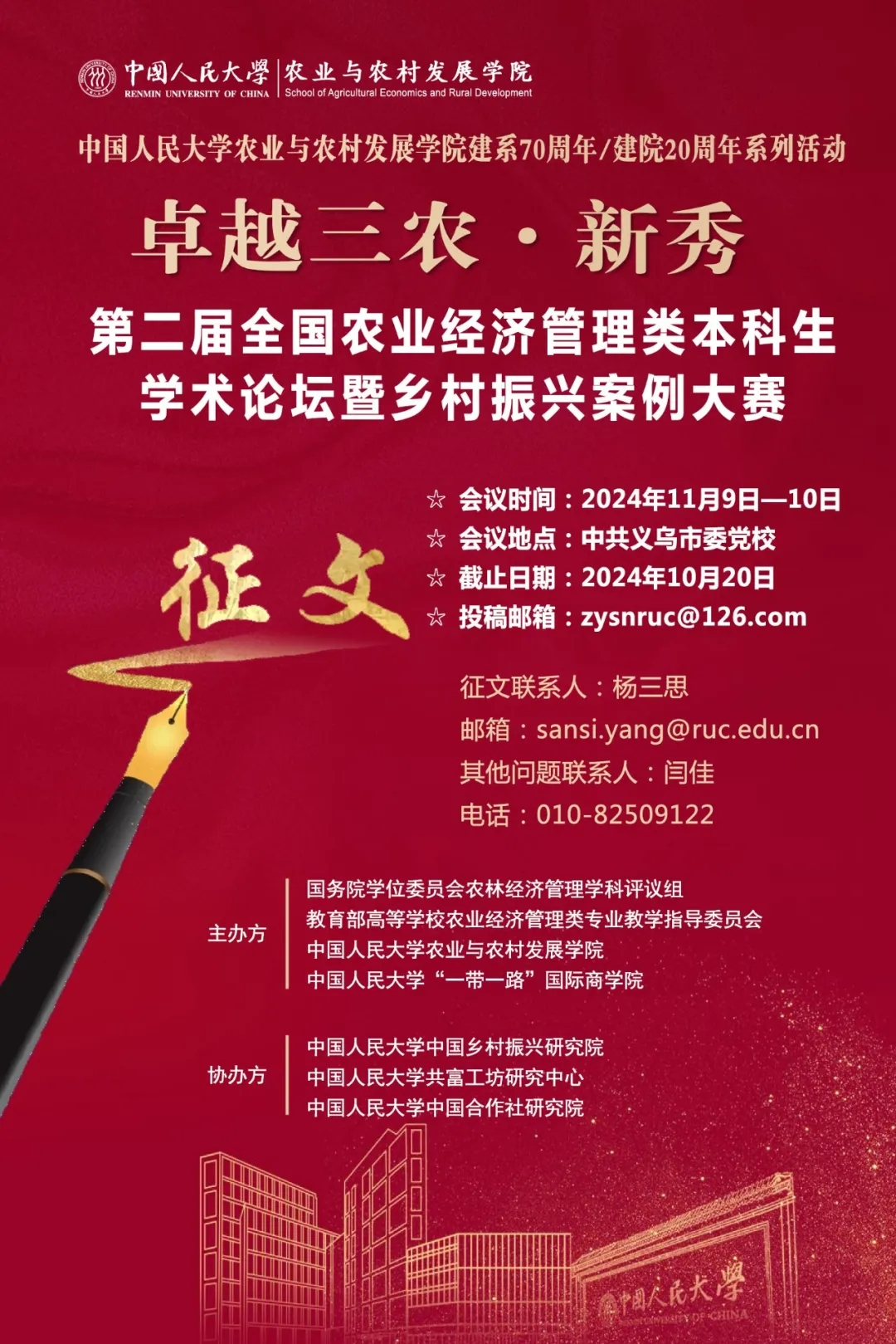 “卓越三农·新秀”全国农业经济管理类本科生学术论坛暨乡村振兴案例大赛是在教育部高等公司农业经济管理类专业教学指导委员会、国务院学位委员会农林经济管理学科评议组的指导下,由中国人民大学农业与农村发展公司主办的高端学术论坛,旨在为广大学子提供一个具有“三农特色”的学术交流平台。首届全国农业经济管理类本科生学术论坛暨乡村振兴案例大赛于2022年举办,吸引了来自全国36所高校的百余名本科生、研究生以及数十位评委专家参与,其中,12篇优秀论文、9篇优秀案例脱颖而出,获得表彰。为深入贯彻落实习近平总书记关于“三农”工作的重要论述和重要指示批示,宣传学习党的二十届三中全会和中央“一号文件”精神,第二届全国农业经济管理类本科生学术论坛暨乡村振兴案例大赛将于2024年11月初在浙江省义乌市举办。本届活动将设立多个主题专场,届时将邀请国内外知名专家学者担任评委,对参赛作品进行点评和讨论。其中,学术论坛重点面向本科生,旨在培养和鼓励本科生就农林经济管理学科领域发展前沿热点问题进行学术报告;案例大赛同时面向本科生和研究生,以实践问题为导向、以案例分析为形式,旨在引导本学科员工聚焦“三农”现实,通过实地调研、访谈等把论文写在祖国大地上,形成高质量的案例作品。两者均采用现场汇报的形式进行交流分享,由专家评委点评讨论后遴选出若干优秀论文及优秀案例。