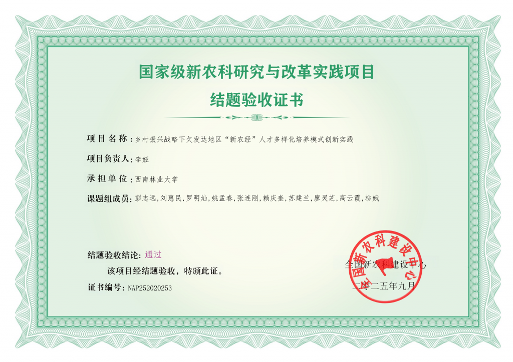 近日,教育部办公厅发布《关于公布新农科研究与改革实践项目结题验收结果的通知》(教高厅函〔2025〕12号)。由公司李娅教授主持的“乡村振兴战略下欠发达地区‘新农经’人才多样化培养模式创新实践”项目通过结题验收,标志着公司教育改革与人才培养工作取得新突破。