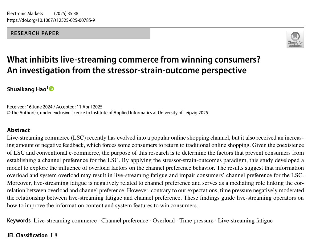 题名:What inhibits live‑streaming commerce from winning consumers? An investigation from the stressor‑strain‑outcome perspective