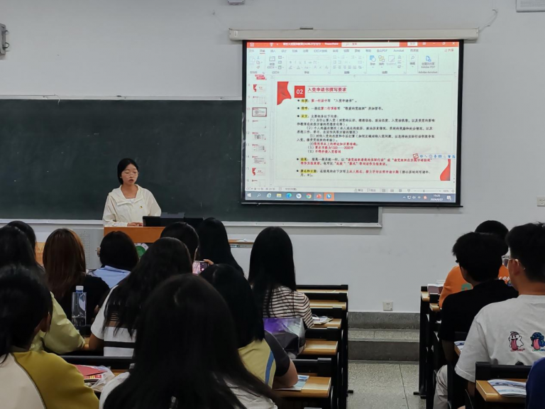 宣讲员为新生们生动讲述了党的发展及奋斗史,让同学们深刻认识到中国共产党人的理想信念、革命意志和政治品格,讲解了发展党员工作流程和如何端正入党动机的相关内容。